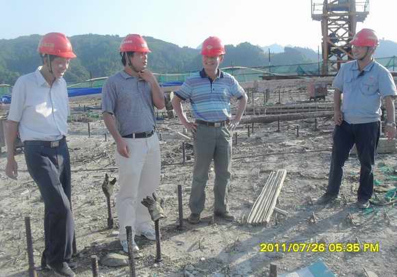 圖為:自治區(qū)交通運(yùn)輸廳王劼耘總工程師(右三)在拉會(huì)高架大橋施工現(xiàn)場(chǎng)調(diào)研指導(dǎo)