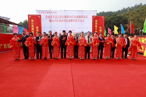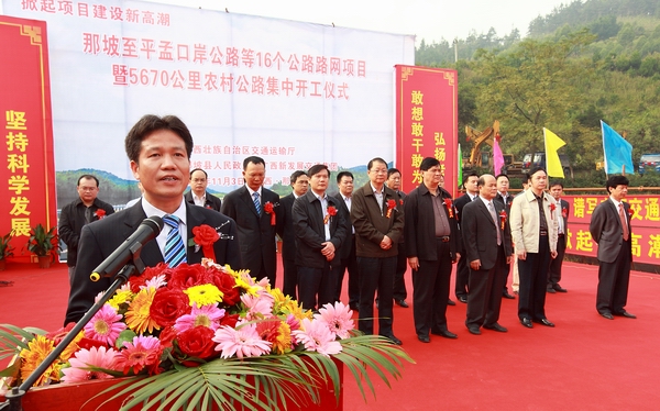 為貫徹落實(shí)自治區(qū)黨委、政府在全區(qū)掀起項(xiàng)目建設(shè)新高潮的決策部署,沖刺第四季度,完成全年公路建設(shè)目標(biāo)任務(wù),自治區(qū)交通運(yùn)輸廳于11月3日舉行全區(qū)公路路網(wǎng)改造項(xiàng)目集中開工儀式。由集團(tuán)公司承辦的分會(huì)場——那坡至平孟口岸公路等16個(gè)公路路網(wǎng)項(xiàng)目暨5670公里農(nóng)村公路集中開工儀式在百色市那坡縣德隆鄉(xiāng)隆重舉行。自治區(qū)交通運(yùn)輸廳紀(jì)檢組長、廳黨組成員朱名勝,百色市市委常委、政法委書記周武紅,市人大常委會(huì)黨組成員黃五同,集團(tuán)公司黨委書記、董事長朱堅(jiān)和、總經(jīng)理李定倫、黨委副書記張友坐、副總經(jīng)理劉明洪、總工程師覃炳賢,自治區(qū)公路管理局、百色市公路管理局、交通運(yùn)輸局、那坡縣四家班子、集團(tuán)公司直屬各單位領(lǐng)導(dǎo)及有關(guān)部門負(fù)責(zé)人等出席開工儀式。