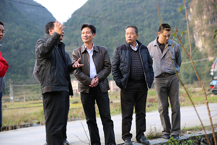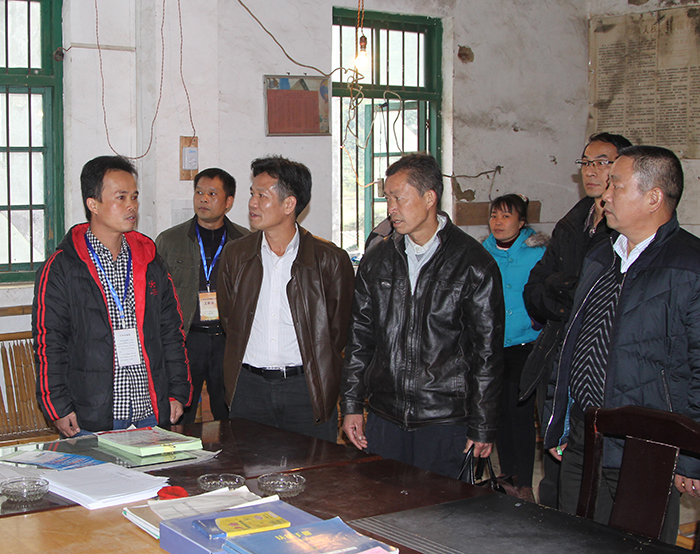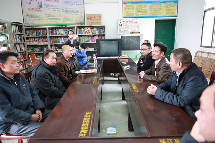 集團(tuán)公司朱堅(jiān)和董事長(左三)、張友坐副書記(右一)聽取駐村”第一書記“梁義寬匯報(bào)工作。 在相堯村、豹山村、才帛村,朱堅(jiān)和董事長分別與當(dāng)?shù)劓?zhèn)、村干部以及覃獻(xiàn)康、梁義寬、蔣博三位派駐農(nóng)村“第一書記”和扶貧工作隊(duì)隊(duì)員進(jìn)行親切交談,詳細(xì)詢問“第一書記”工作、生活情況,并聽取了“第一書記”關(guān)于幫扶村的黨建及村集體經(jīng)濟(jì)發(fā)展情況匯報(bào)。得知目前各駐村書記及扶貧工作隊(duì)員已經(jīng)完成精準(zhǔn)扶貧入戶摸底調(diào)查時(shí),朱堅(jiān)和董事長對(duì)“第一書記”到村以來,深入調(diào)查走訪,積極幫助村里理思路、定規(guī)劃、辦實(shí)事,表示充分肯定。