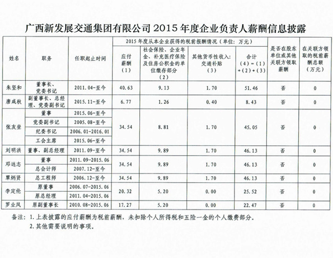 廣西新發(fā)展交通集團有限公司2015年度企業(yè)負責人薪酬信息披露