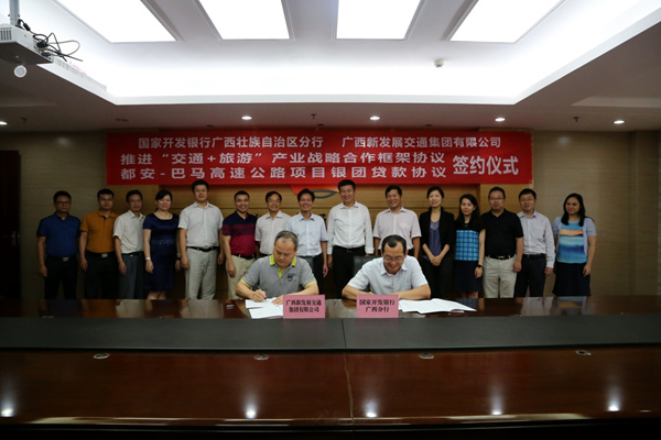 6月9日,集團(tuán)公司與國(guó)家開發(fā)銀行廣西分行在南寧簽訂戰(zhàn)略合作框架協(xié)議。集團(tuán)公司黨委書記、董事長(zhǎng)朱堅(jiān)和,黨委副書記、副董事長(zhǎng)、總經(jīng)理唐咸秋,黨委委員、總會(huì)計(jì)師鄧遠(yuǎn)志,國(guó)家開發(fā)銀行廣西分行黨委書記、行長(zhǎng)謝志軍,副行長(zhǎng)呂軍等領(lǐng)導(dǎo)出席簽約儀式。簽約前,雙方進(jìn)行了友好會(huì)談,雙方重點(diǎn)圍繞賀州至巴馬高速公路、融水至河池高速公路、國(guó)省干線公路及沿線地區(qū)的“交通+旅游”項(xiàng)目開展深度戰(zhàn)略合作等方面進(jìn)行了深入的交流與探討,并達(dá)成了一致共識(shí)。座談會(huì)后,唐咸秋與呂軍分別代表雙方簽訂戰(zhàn)略合作框架協(xié)議。雙方有關(guān)部門負(fù)責(zé)人參加簽約儀式。(集團(tuán)公司 投資改革發(fā)展部)