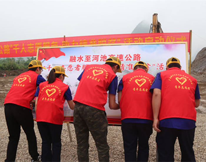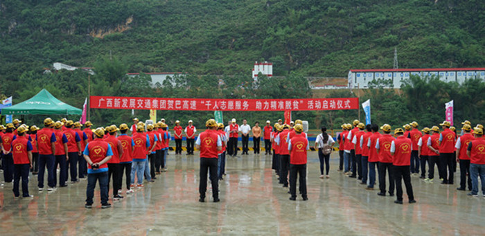 新恒通公司黨委書記、董事長賴水平介紹,集團公司所建設的賀州至巴馬、融水至河池高速公路是廣西縣縣通高速公路重點工程,沿線大部分縣區(qū)仍屬貧窮縣。為響應中央精準扶貧和建設美麗中國的號召,擔負起國企的社會責任,新恒通公司組織全線參建單位成立青年志愿者服務隊,結合項目實際,從2018年1月至2020年12月在賀巴、融河等高速公路全線范圍內(nèi)開展為期三年的“千人志愿服務,助力精準脫貧”活動。