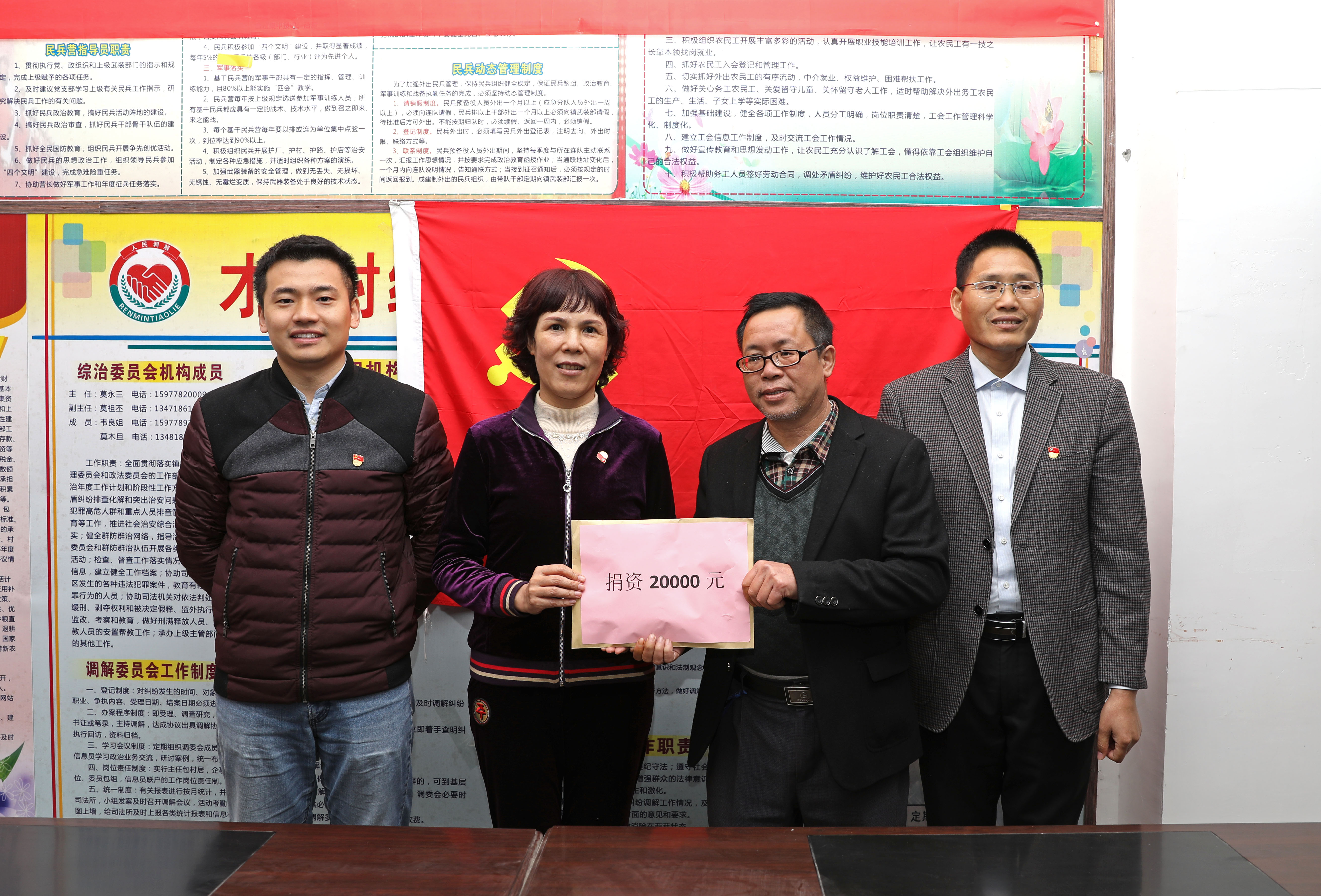 圖為翔路公司黨委向環(huán)江縣明倫鎮(zhèn)才帛村捐款2萬元用于修建垃圾焚燒爐
