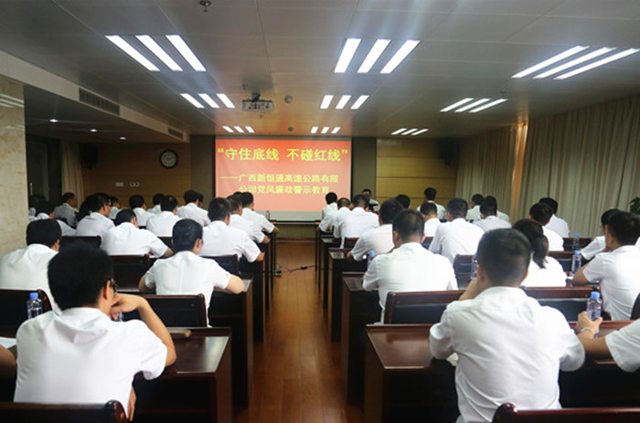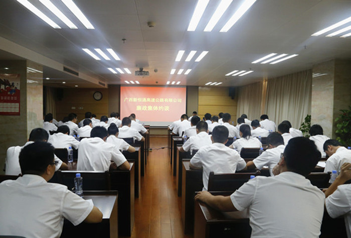 活動上,新恒通公司黨委書記、董事長賴水平還對與會人員進行了廉政集體約談。賴水平感謝吳雄飛老師給大家上了一堂別開生面的廉政警示教育課,作為交通基礎設施建設行業(yè)的業(yè)主單位,在廉潔從業(yè)的道路上,他提出幾點要求和期望:一是加強學習,提升道德修養(yǎng),堅定理想信念;二是嚴于律己,規(guī)范作風行為,筑牢防腐堤壩;三是嚴以用權,增強廉政意識,緊守從業(yè)底線;四是守土有責,堅持“一崗雙責”,深化責任落實。賴水平強調,廣西交通基礎設施建設正處于大有可為、大有作為的歷史機遇期,面對紛繁復雜的形勢,全體黨員干部要在黨的十九大精神的指引下,緊緊圍繞公司總體工作思路和目標,統(tǒng)一思想,堅定信念,持續(xù)加強作風建設,堅決把紀律挺在前面,耳邊常響廉潔警鐘,心中常筑反腐防線,用廉潔從業(yè)的實際行動為公司“縣縣通”高速公路建設事業(yè)的發(fā)展保駕護航。