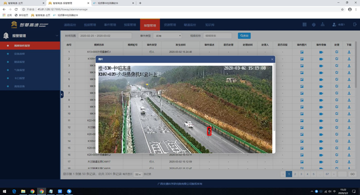 近日,昭平運(yùn)營管理中心智慧高速軟件平臺(tái)引入了“人工智能事件檢測報(bào)警系統(tǒng)”。該系統(tǒng)采用了人工智能深度學(xué)習(xí)技術(shù),在鐘昭高速每2公里一個(gè)監(jiān)控?cái)z像機(jī)的硬件基礎(chǔ)上,能夠?qū)崿F(xiàn)鐘昭高速全線事件檢測全面覆蓋,快速發(fā)現(xiàn)路上異常情況并發(fā)出警報(bào)。
